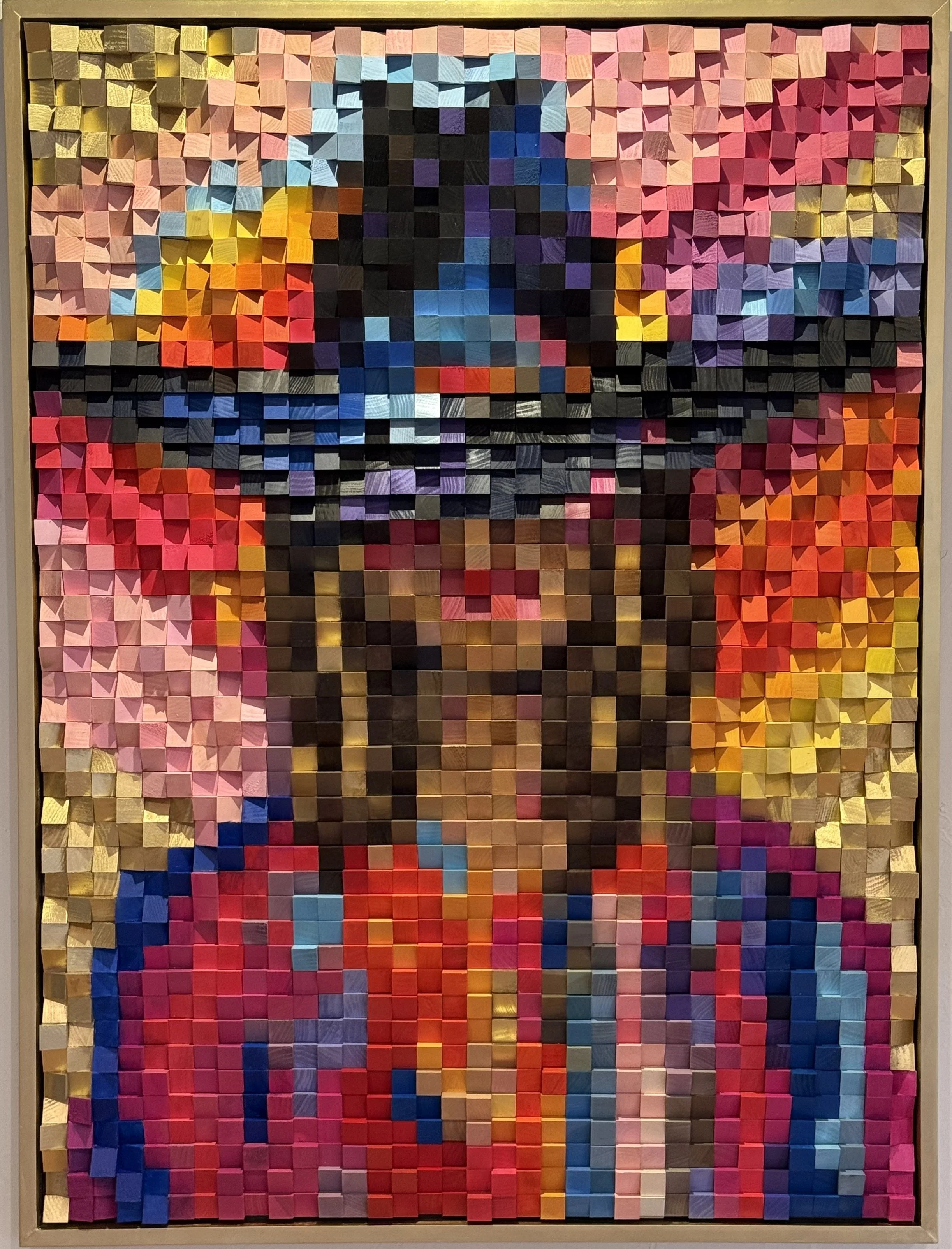 Created for exhibition at Blue Hills Round Top, “Brondes Have More Fun” celebrates a woman’s confidence and individual glamour. The piece is composed of hand-cut wooden tiles, painted and placed for visually captivating depth and vibrance within the composition. The dramatic hat silhouette and addition of metallic gold to a vivid color palette blends Western influence with contemporary artistry. The inherent texture of the piece allows the portrait to shift subtly as light and perspective change – a characteristic feature of each Jody Dodson artwork.