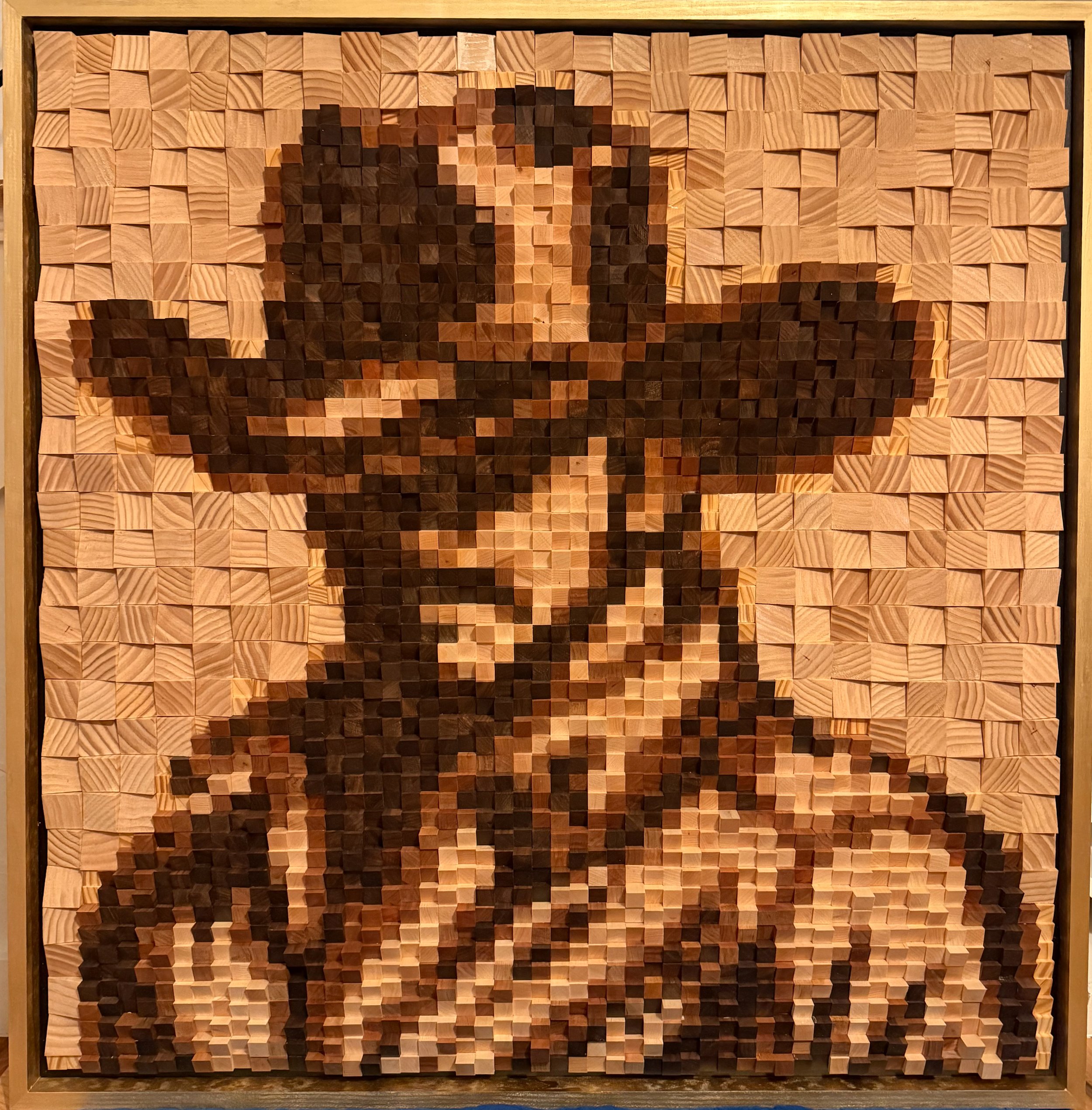 “Shrouded Wrangler” was created for exhibition at Blue Hills in Round Top, Texas. The piece portrays a cowboy partially obscured beneath the brim of his hat, his expression quiet and contemplative. The piece is constructed from hand-cut and stained wooden tiles crafted from black walnut, cherry, maple, and prime pine. Rather than relying on painted color, the portrait emerges through the natural tonal variations of the wood itself. Deep walnut shadows and warm cherry tones define the cowboy’s silhouette, while lighter prime pine creates a subtle contrast within the background. The intricate grain patterns and carefully placed pieces reveal the craftsmanship and natural beauty of the materials, while allowing the cowboy’s expression to emerge gradually from the surface of the piece. The background introduces variation in texture, where the wood tiles shift in direction and elevation and create movement across the artwork. “Shrouded Wrangler” reflects the resilience, independence, and quiet strength associated with the cowboys of Texas and the broader American frontier.