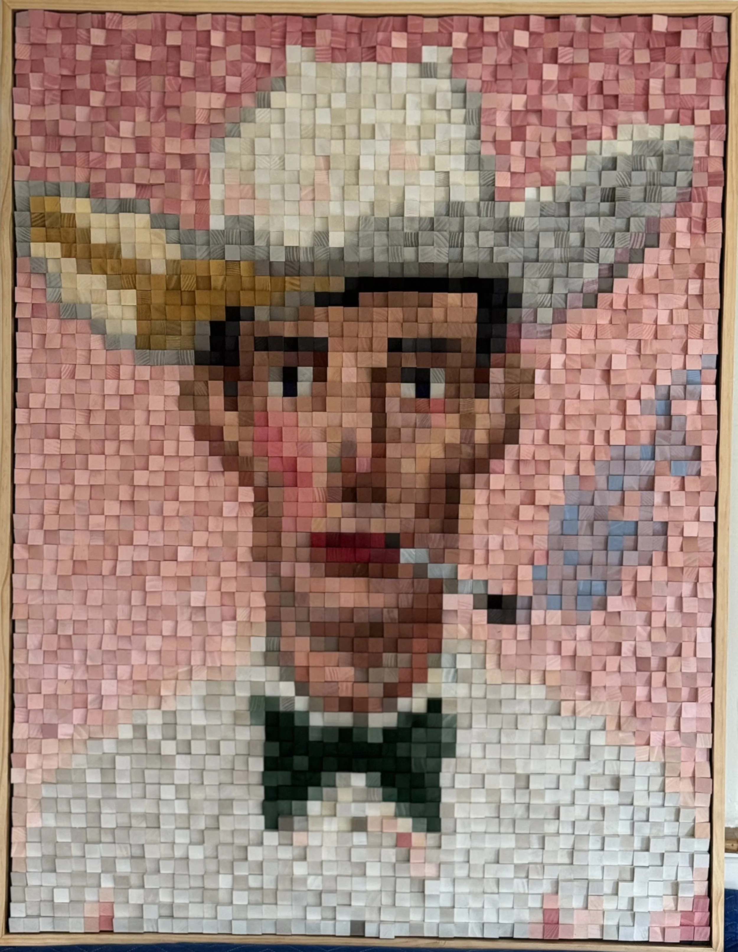 Commissioned as a large-scale custom piece, “Smokin’ Hot” is composed of 2,867 individually hand-cut wooden tiles arranged to form a bold portrait measuring 4.2” x 5.4”. Set against a warm pink background, the cowboy’s confident gaze and casually held cigarette, with its curling trail of smoke, give the piece a sense of playful personality and charm. The figure’s hat and classic Western styling evoke vintage Americana, while the soft tonal shifts created by each wooden tile add depth and movement across the portrait. The striking and charismatic subject constitutes a finished work that balances humor, nostalgia, and craftsmanship.